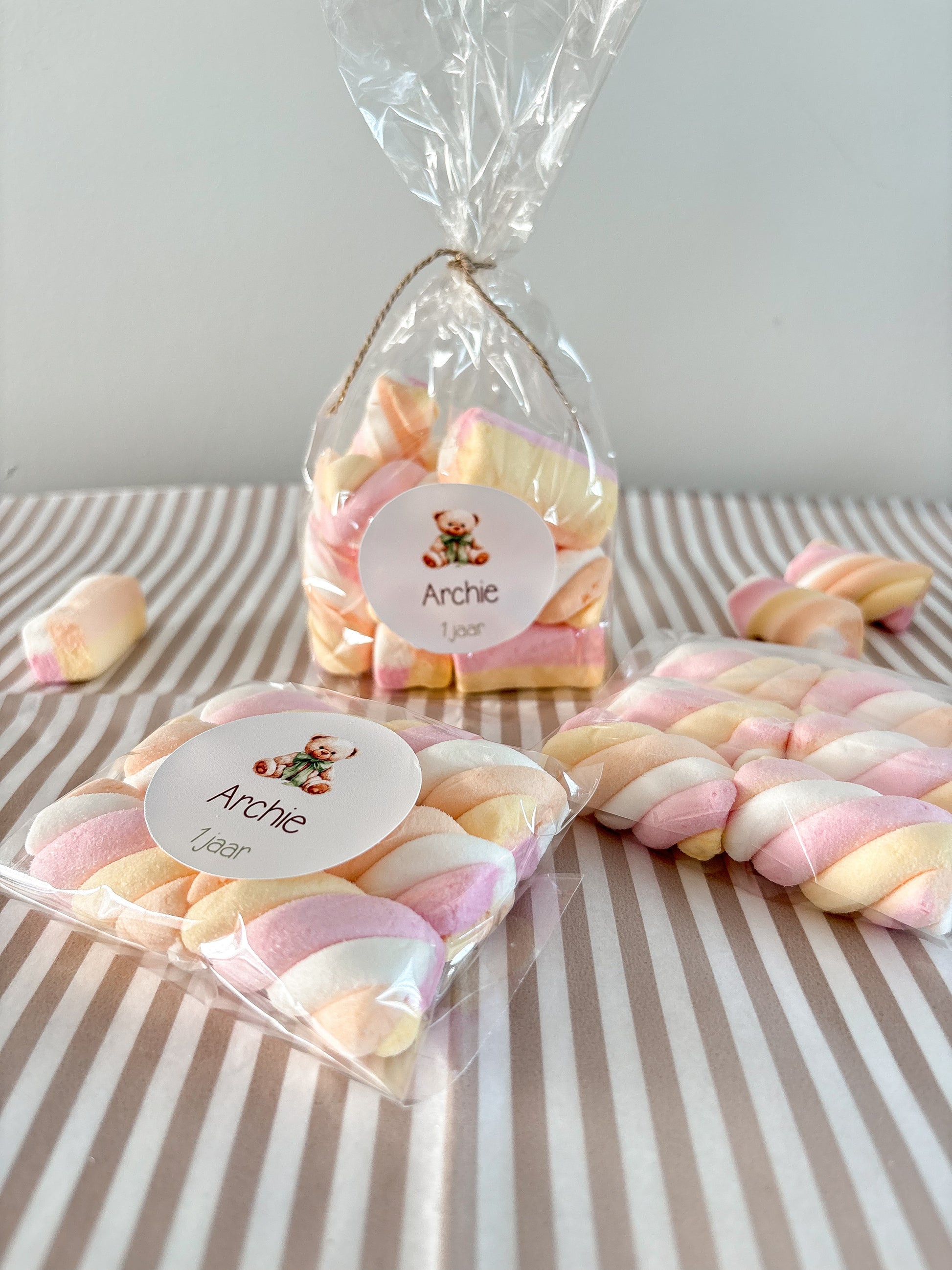 Small zoet zakje gevuld met mallows, afgewerkt met een ronde gepersonaliseerde sticker.